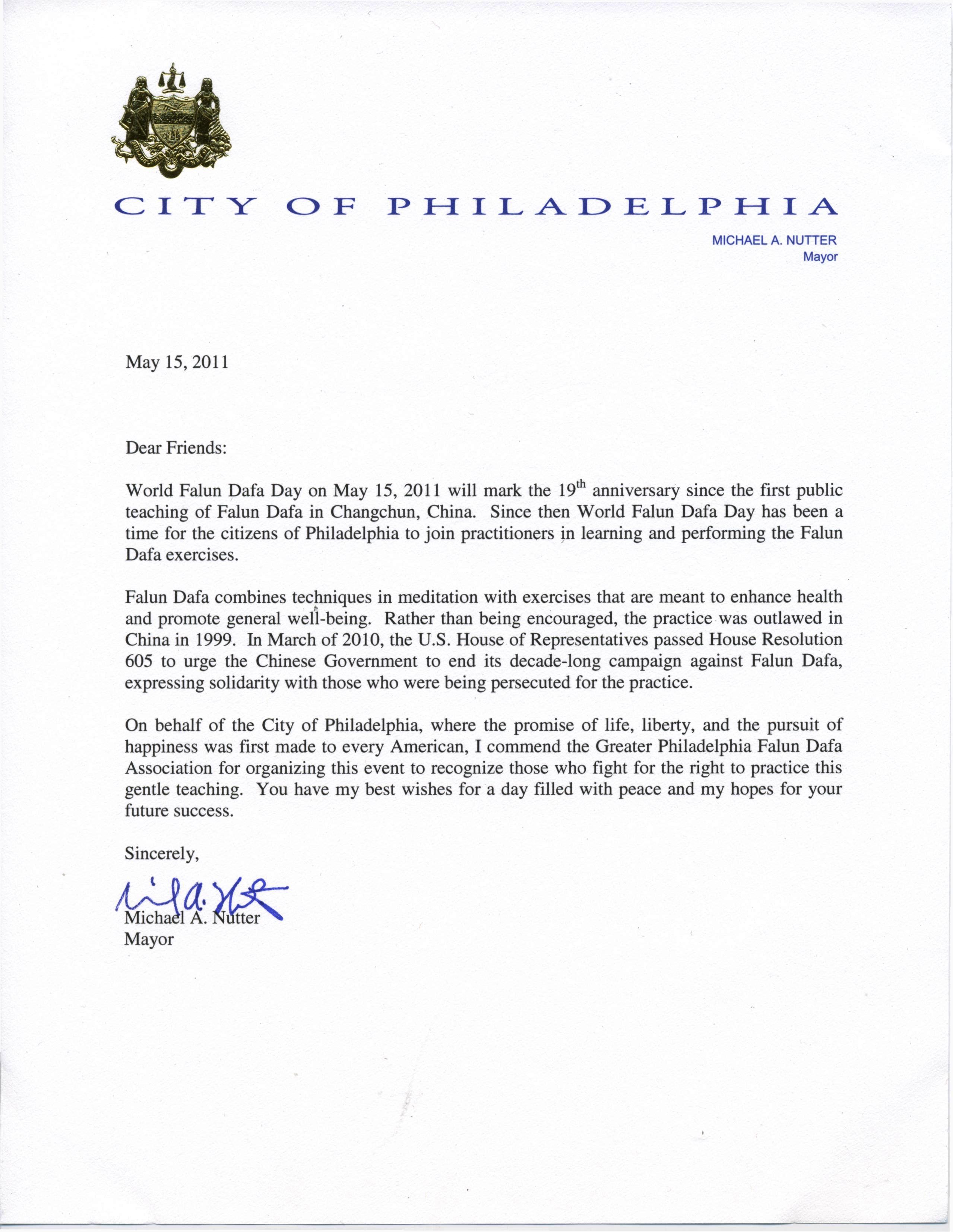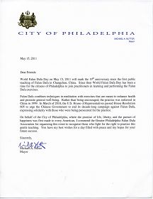 我谨代表费城市,这个首次为每一个美国人作出对生命、自由和追求幸福承诺的地方,向大费城法轮大法学会举办这次活动予以表扬,支持那些为修炼这个柔和功法而争取权利的人们。我衷心祝愿法轮大法日充满和平,希望你们未来成功。
