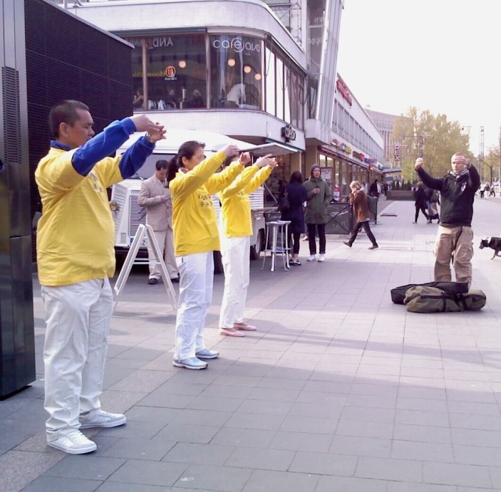 学习音乐的学生叶莱姆•快客,从活动一开始到结束一直跟着习炼法轮功,他说:“这就是我要找的,这是我生命的目的地,刚才我路过这里,感到全身有种暖暖的能量,我手臂受过伤,花了五千欧元也没有治好,我开始寻找中国的气功。我决定炼法轮功。我不理解这么平和的功法中国政府为什么会反对?也许这个政府就不希望人们过的好吧。”