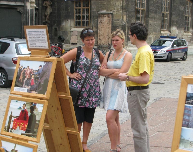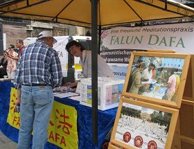 一位奥地利老太太在展位前驻足良久,她对一位学员讲,他们这一代原本对中共抱有很多幻想,但从中国传来的消息令他们越来越失望;但她却没有想到在中国对法轮大法的迫害竟是这么残酷。她收下关于大法真相的报纸要回家好好阅读。