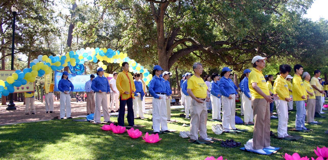 ![]() 德克萨斯州学员欢庆大法日学员 荷门公园炼功 |
