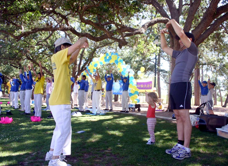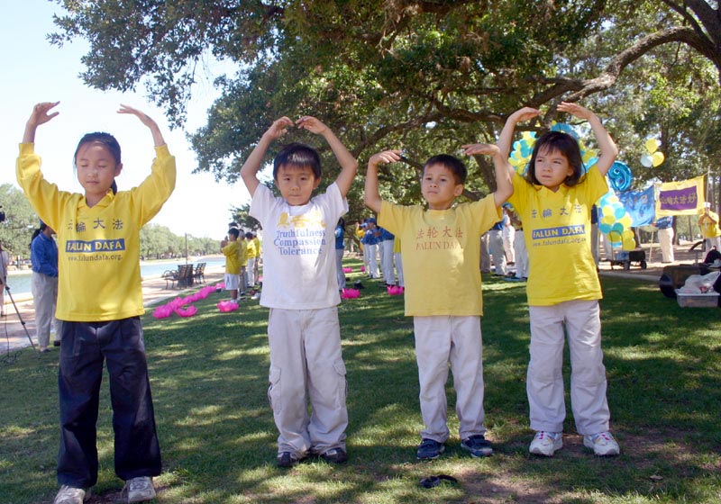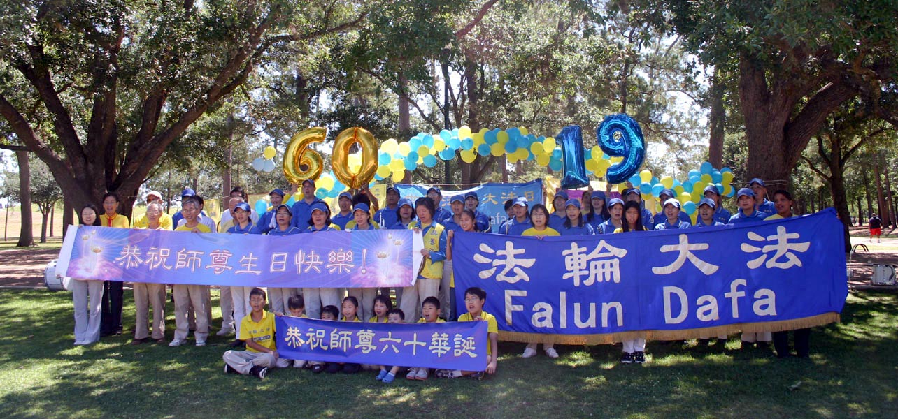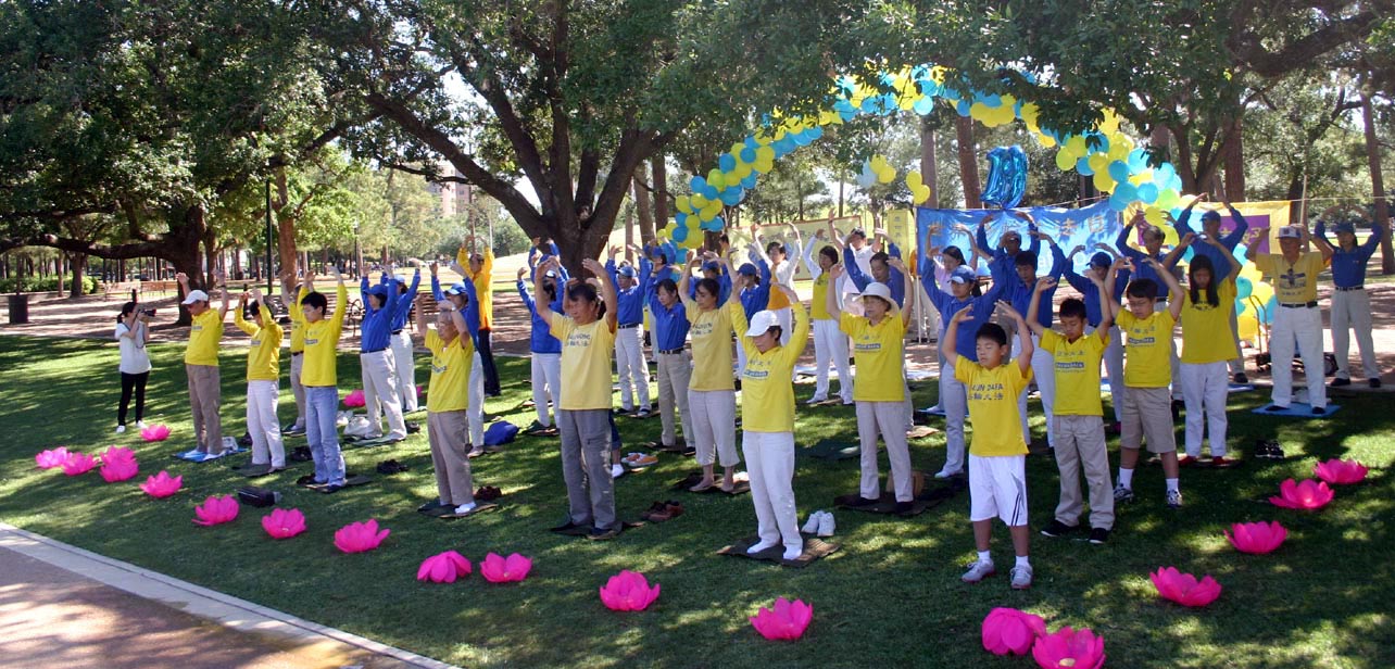 荷门公园(Hermann Park)是休士顿公园,常有游客到公园游玩。当天,阳光灿烂。上午九点至十一点半,德克萨斯州学员在公园炼功,一部份学员持着横幅:“普天同庆同贺世界法轮大法日,”“恭祝师尊六十华诞,”“法轮大法好”上面悬挂气球,呈现节日的气氛,一部份学员在草地上炼功,明慧学校的小弟子在老师的带动下,兴致勃勃的炼功。场面祥和。节日的气氛和法轮功功法吸引了游人。