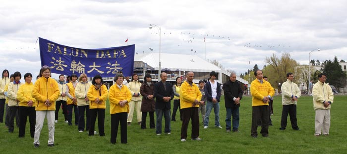 ![]() 法轮功学员五月七日在Dow’s Lake湖畔集体炼功。 |