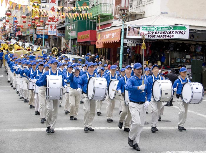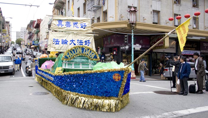 游行队伍最前列是“世界法轮大法日”巨型横幅,接着由北加州法轮大法天国乐团的队列开阵,再有炼功队、横幅、标语和旗帜的庆祝队伍随后,队伍的最后,是由装点一新的“法轮大法好”花车压阵。伴随天国乐团雄壮嘹亮的行进曲,沿途街道上行人驻足观看,尤其行至唐人街繁华街区,吸引众多市民的注目,市民们鼓掌、竖起大拇指,不少游客摄影、拍照。