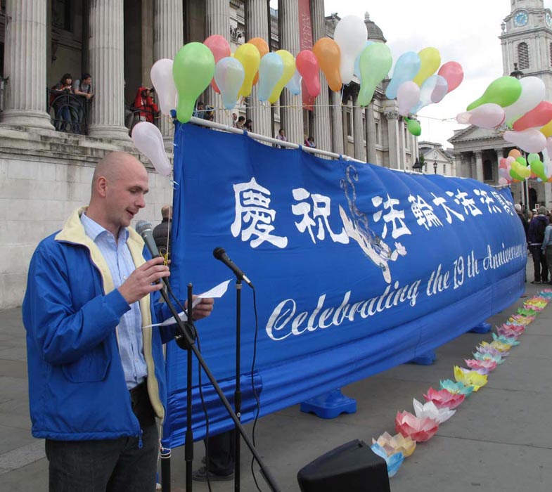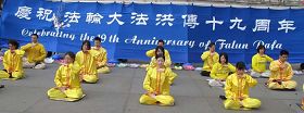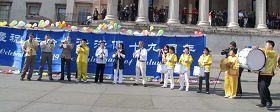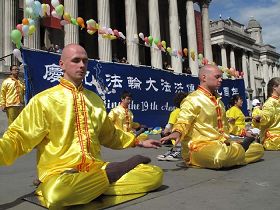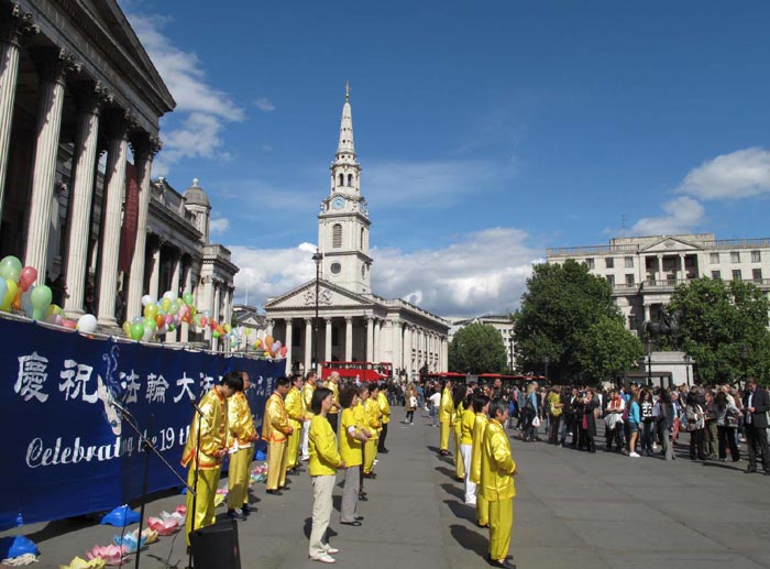 ![]() 法轮功学员在英国伦敦鸽子广场庆祝法轮大法洪传世界十九周年 |