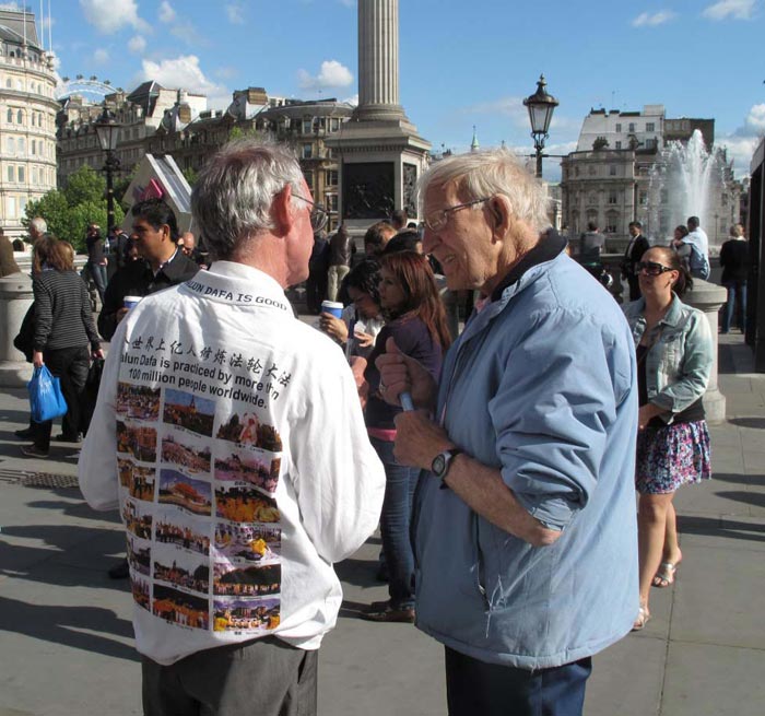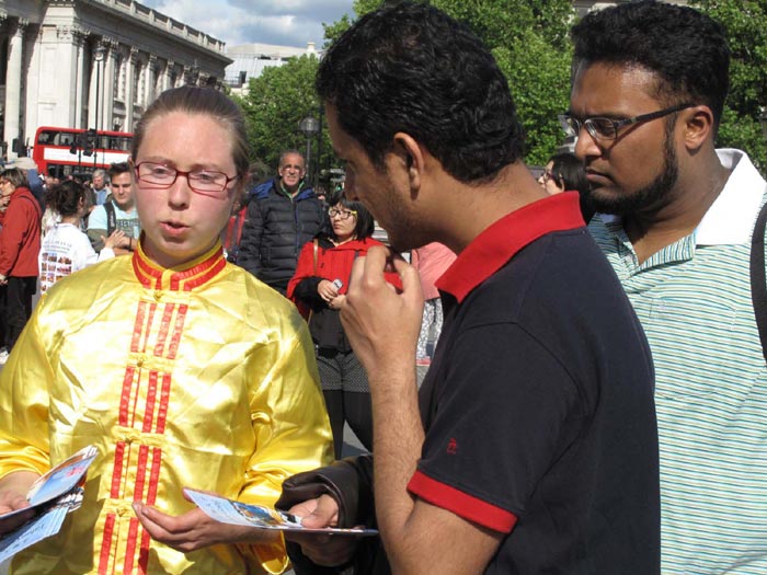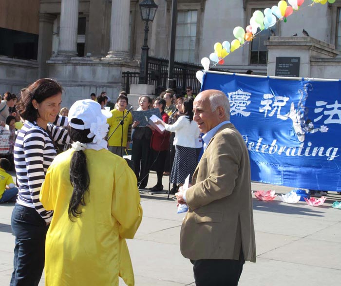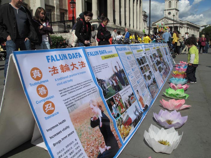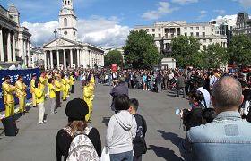 对法轮功学员来说,五月十三日世界法轮大法日不但是个欢庆的日子、感恩的日子,还是一个让更多世人了解法轮功真相的日子。十四日星期六,位于伦敦市中心的著名的鸽子广场一带人山人海,法轮功学员的到来,为热闹的广场增添了隆重的节日气氛和亮丽的色彩,庆祝活动吸引了众多游客的目光和驻足观看。