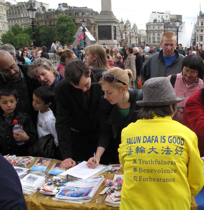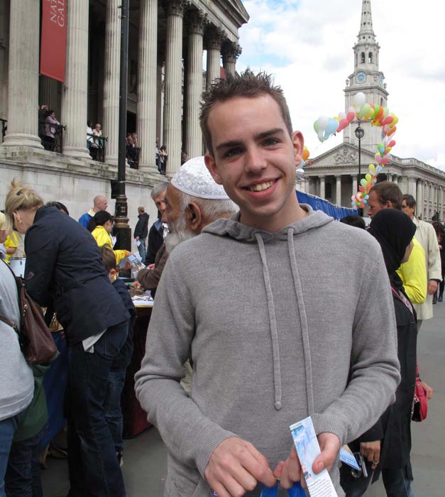 驻足观看庆祝活动的西方民众中很多是第一次看到法轮功,但是他们一了解到法轮功被迫害真相后,马上毫不犹豫地在反迫害征签表上签名。英国小伙子瑞恩·麦克白就是他们当中的一位。他说:“我今天第一次听到有关的迫害,我反对迫害,因为我认为每个人有选择(自己信仰的)权利,因此我刚才在征签表上签名。我不能同意人们仅仅因为修炼功法就被迫害,而且这个功法是这样平和,我不能理解为什么会因此受迫害。”