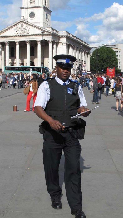 一位正在担任鸽子广场保安工作的警察也在一旁认真观看法轮功功法,他表示:他的直觉告诉他,法轮功是非常好的功法,非常平和,他真的考虑要尝试一下。