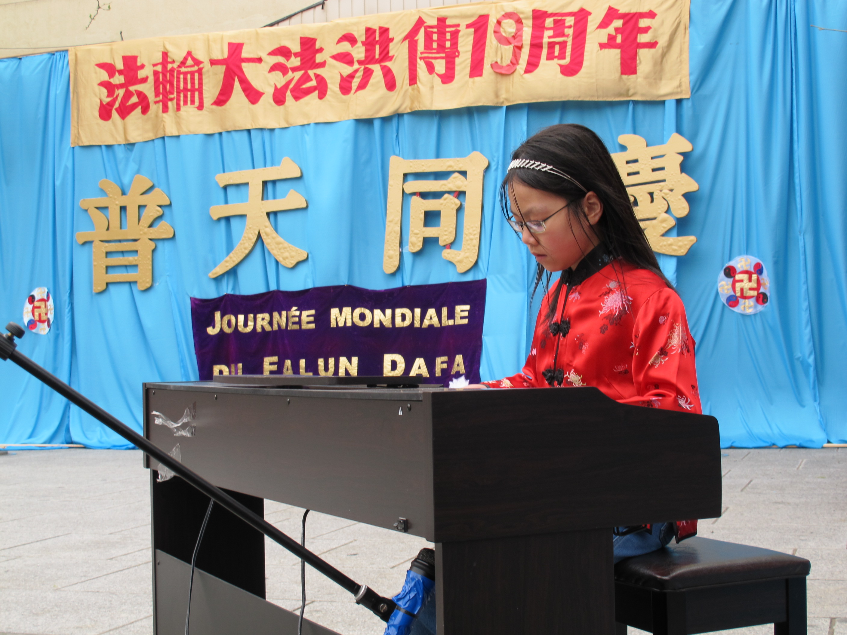 集会中,主持人用中、法、英文介绍了法轮大法洪传世界的盛况。二十位法轮功学员分组表演法轮功五套功法,主持人分别介绍每套功法给人体带来的变化。曾在加拿大国庆游行中获得总统奖和最佳军乐团奖的天国乐团演奏了《法轮大法好》、《法鼓法号震十方》、《送宝》、《法正乾坤》和《法轮圣王》等曲目,吸引了很多民众观看。