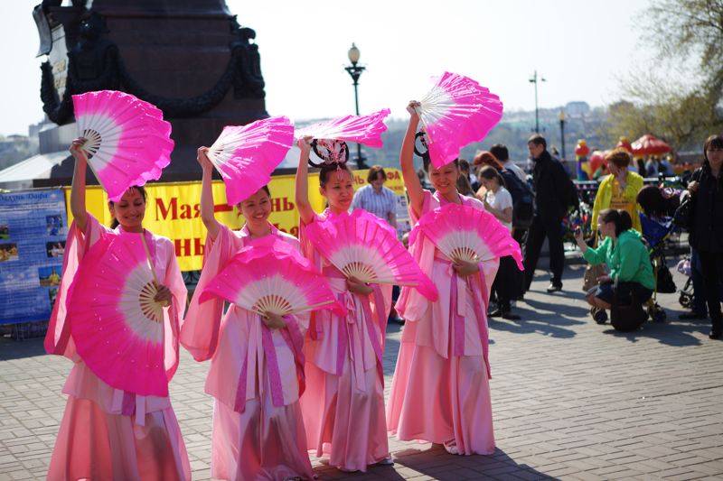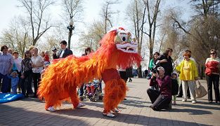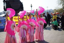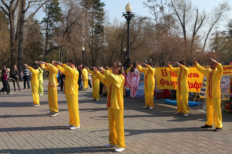 【明慧网二零一一年五月十八日】二零一一年五月十三日,在俄罗斯远东地区的伊尔库茨克市,法轮功学员举办活动庆祝第十二届世界法轮大法日。学员们演示了功法,散发介绍法轮功的真相资料,并以歌舞和舞狮、舞龙等精彩的文艺节目庆祝这个盛大的节日。