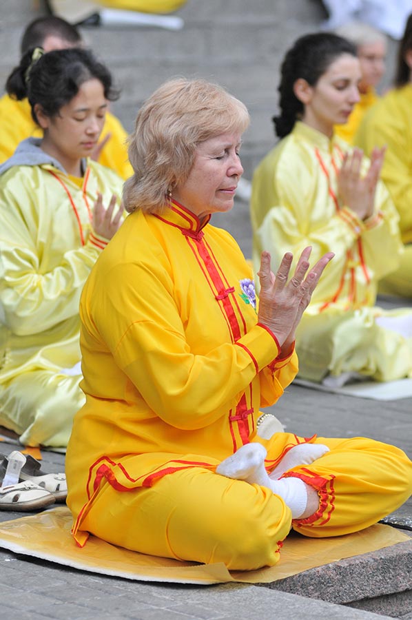 次日,十四日中午,法轮功学员们在基辅市五处景点同时开始举行庆祝活动。盛装的仙女,欢快的腰鼓表演,祥和的炼功队列,飘扬的彩旗,圣洁的纸莲,甜美的微笑……傍晚六点,所有的法轮功学员又汇集到市中心“荷里夏”大街,继续向世人传播善的种子。