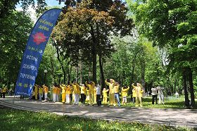 ![]() 十四日,乌克兰法轮功学员在基辅市中心展示法轮功功法,庆祝第十二届世界法轮大法日。 |