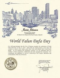 我欣喜万分的表彰休斯顿法轮大法日。法轮大法是根植于古老中国文化,基于宇宙特性真、善、忍的美好修炼系统。法轮大法于十九年前传出以来,已经帮助一百多个国家成千上万的人改善了他们的身体健康、净化了心灵,提高了生活品质。在此重要时刻,我很荣幸能向法轮大法日表达敬意。