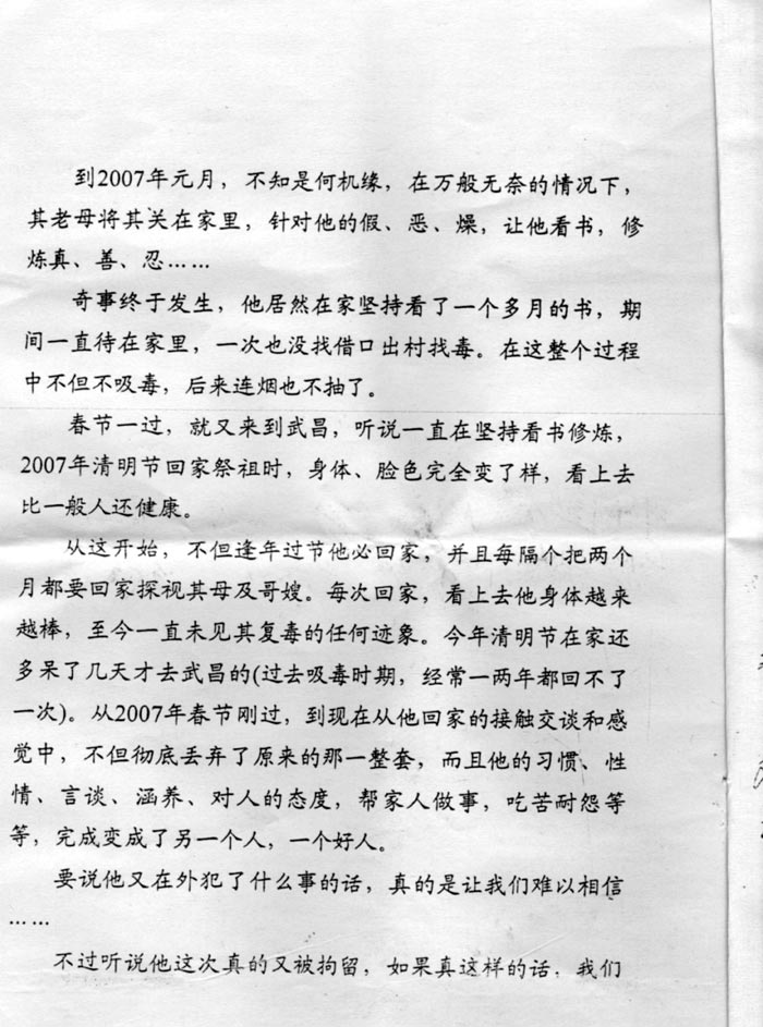 人的命运就是很难说的。到二零零七年元月,不知是什么机缘,刘社红居然将自己关在家里埋头看起一种书来,一个多月中,他就是入迷的看这书。这期间,他母亲高兴的看到,他一直待在家里,一次也没找借口出村找毒品了。新年一过,他又前往武昌,到了武昌也一直在坚持看书。二零零七年清明节期间,他母亲居然看到那个不孝的儿子知道回家祭祖了,儿子的身体、脸色完全变了样,看上去比没吸过毒的人还健康。他母亲这才断定是看那种书起了大作用。这是一种什么书呢?原来是教人向善的法轮功的书,是书中讲做人的道理深深的震撼了刘社红内心,是法轮功的五套功法极快的改善了刘社红的身体状况。