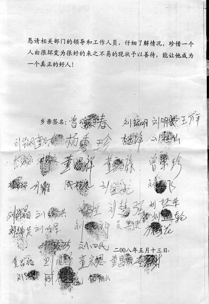 据了解,早在二零零八年五月四日,刘社红在武汉市江夏区喷真相标语时,遭江夏区法泗派出所绑架。听说刘社红被抓,乡亲们和咸安区大桥村村委会纷纷签名,证明刘社红由坏人变好人的经历(见图一、图二),希望公安能把刘社红放了。乡亲们在“证明”的结尾说道:“我们恳请相关部门的领导和工作人员,仔细了解情况,珍惜一个人由很坏变为很好的来之不易的现状予以善待,能让他成为一个真正的好人!”(见图一)。遗憾的是,武汉市“六一零”漠视民意,将刘社红非法抛进了武汉市何湾劳教所。劳教所里的人员中有以前认识刘社红的,都感叹道:“以前刘仔(刘社红混名)是满眼凶光,现在是慈眉善目,法轮功真神奇,想不到。”