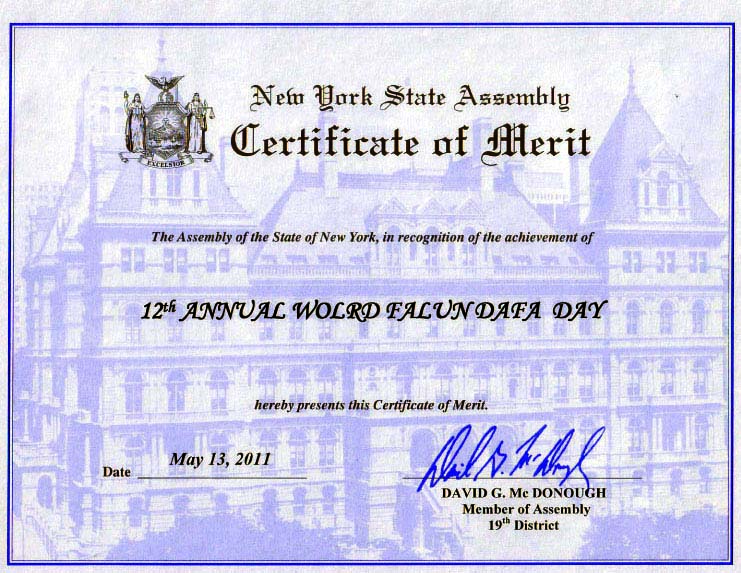 此前,二零一一年五月三日,美国纽约州参议院通过立法决议,宣布二零一一年五月为“世界法轮大法月”。纽约州众议员奥蒂兹(Felix W. Ortiz)颁发褒奖令,褒奖法轮大法创始人李洪志先生,并宣布二零一一年五月为“法轮大法月”。美国纽约州众议员库斯奎卓(Daniel P. Losquadro)颁发褒奖令,庆祝二零一一年五月十三日“世界法轮大法日”。