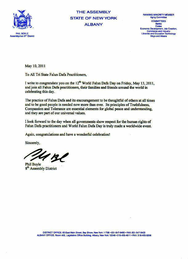 ![]() 纽约州第八区众议员比尔•博伊尔的贺信 |