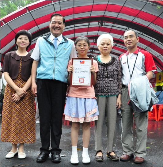 ![]() 翁婷和父母及奶奶一家四口于颁奖典礼后,和新竹市长许明财(左二)合影 |