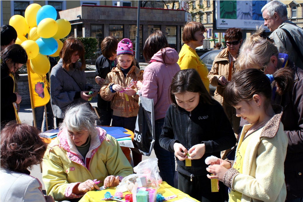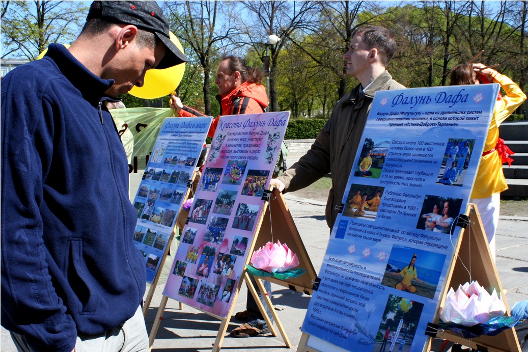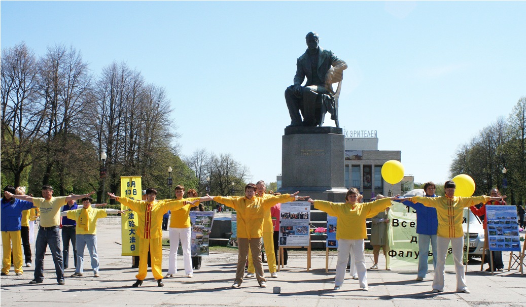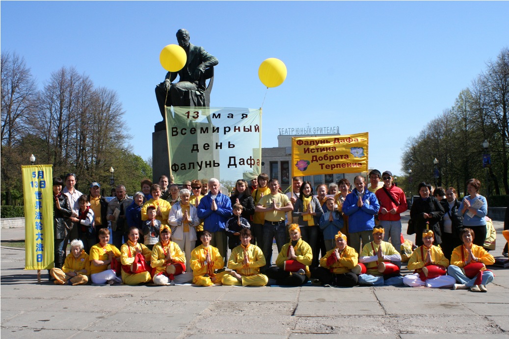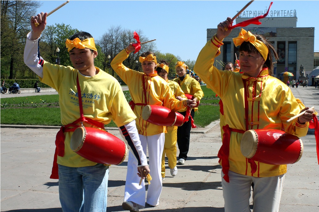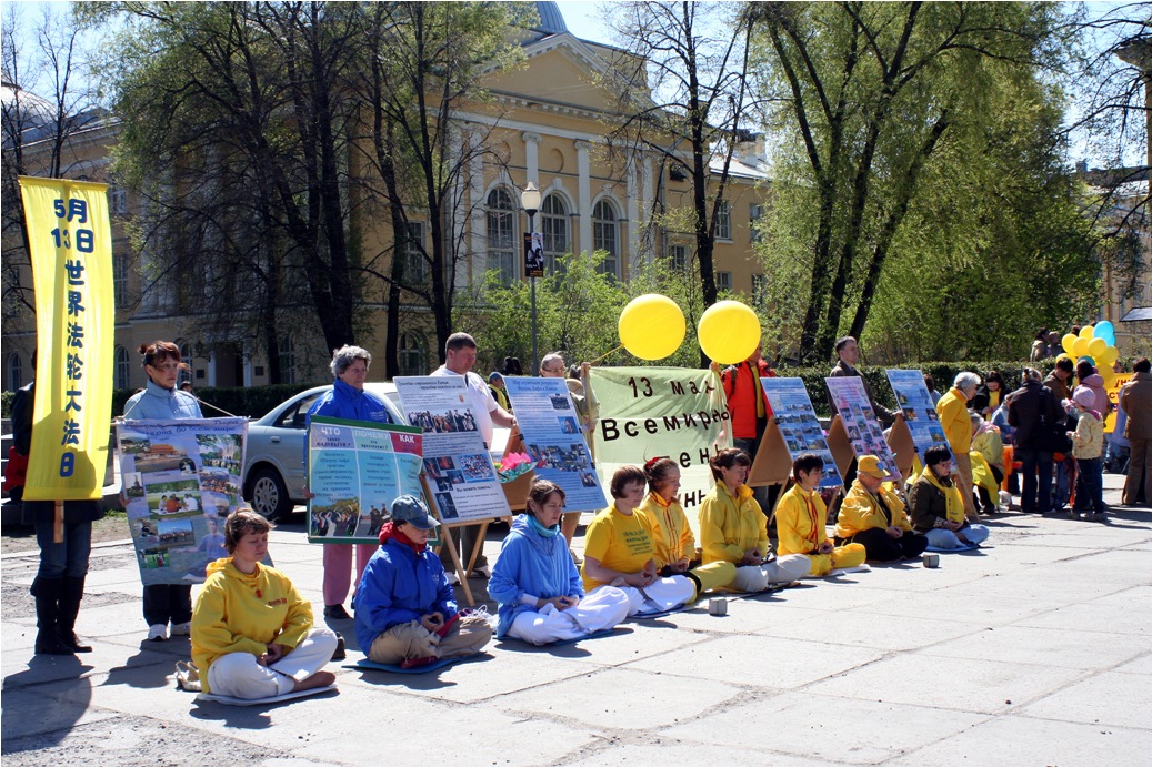【明慧网二零一一年五月二十一日】五月十三日世界法轮大法日是一个神圣的日子,一九九二年的这一天,李洪志大师开始向世人洪传法轮大法。二零一一年五月十三日,俄罗斯圣彼得堡的法轮大法弟子汇集在位于市中心的儿童剧院广场,以集体炼功、腰鼓表演等形式庆祝这个节日;集会吸引了很多市民观看,并了解法轮功的真相。
