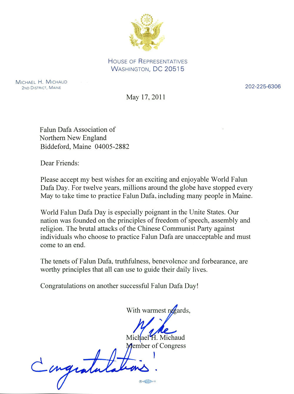 请接受我对令人兴奋和愉快的“世界法轮大法日”最美好的祝福。十二年来,全球数以百万计的人,包括许多缅因人在每年五月放下琐事来修炼法轮功。