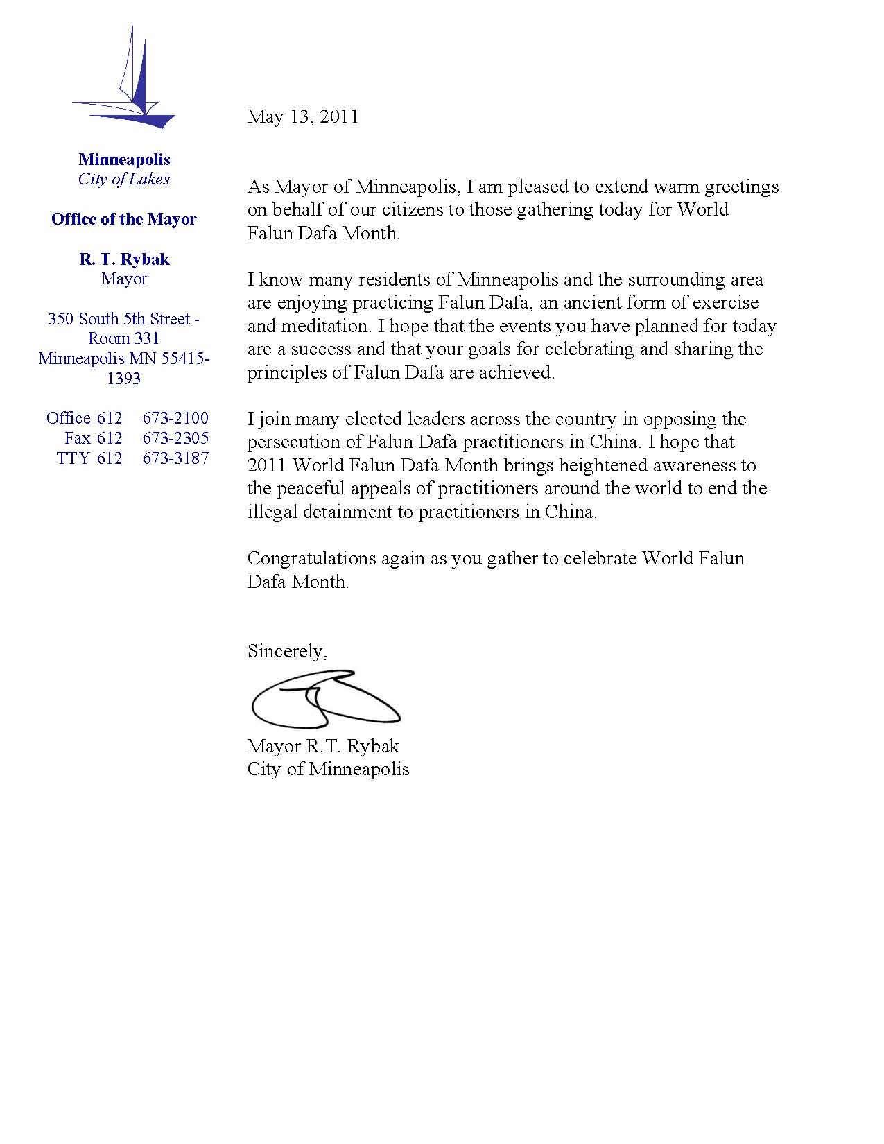 五月十三日是世界法轮大法日,明尼阿波利斯市市长瑞巴克(R.T. Rybak)发来贺信,他并表示,“我加入美国众多民选领导者的队伍,反对中共对法轮功的迫害。”