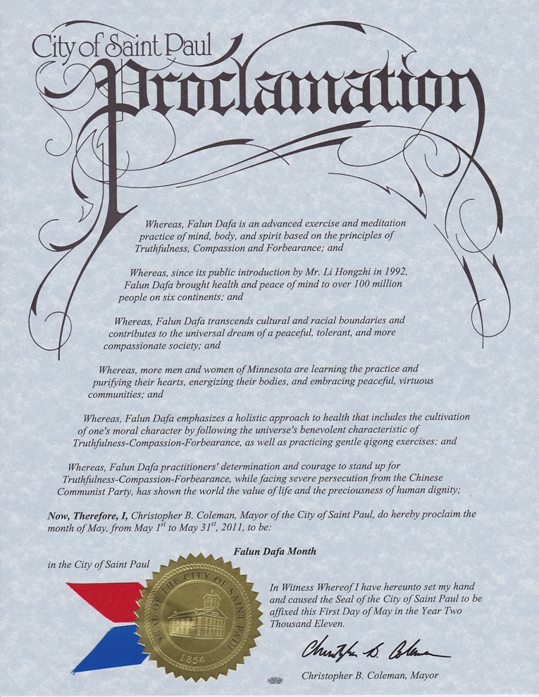 鉴此,我,克里斯多福·寇尔曼(Christopher B. Coleman),圣保罗市(City of Saint Paul)市长,特此褒奖二零一一年五月为“法轮大法月”