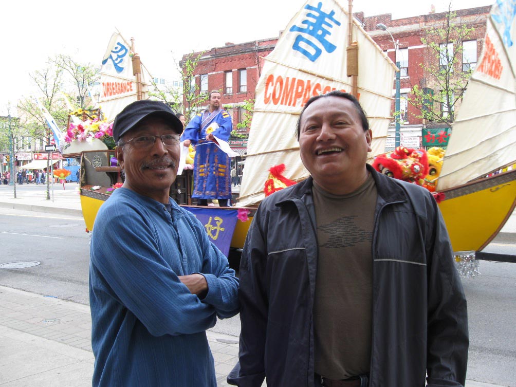西人餐馆的工作人员 Favien 和Denise在餐馆的门口观看游行,不停的鼓掌,Favien说:“我喜欢这个游行中所有的东西,包括乐团、舞狮队等等,我知道法轮功被迫害的情况,自由和人权应该是每个人应有的权利。”