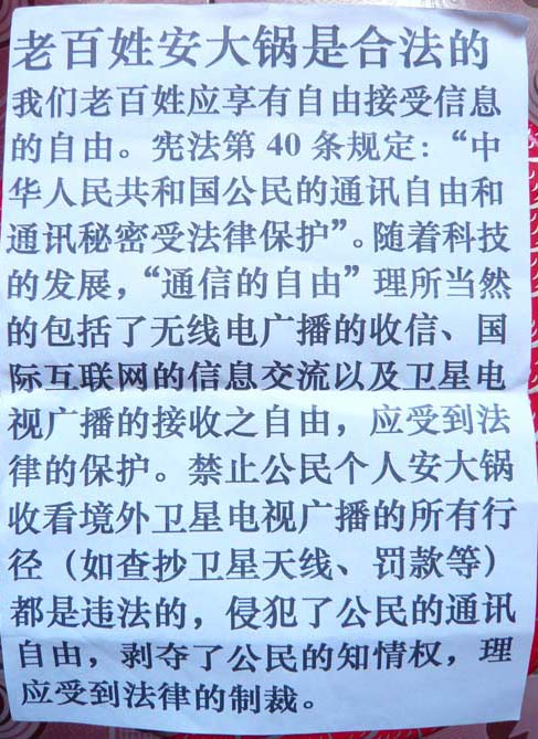 零九年在一个修炼人家里安装卫星接收器(大锅)。家里的男主人通过不断的收看新!唐!人:电视节目,明白了中共邪*党-的造假宣传及其迫害大法弟子的罪恶行径。再加上妻子(大法弟子)的不断帮助,他现在也走入了修炼的行列。他家是一个食杂店,来往的人很多,他和妻子互相配合对来人讲真相和劝三:退.。他把在新!唐!人:电视台里看到的真相讲给来食杂店买货的人听,告诉他们只有相信法轮大法,退出中共邪*党-的一切组织,才能顺天意,有未来。