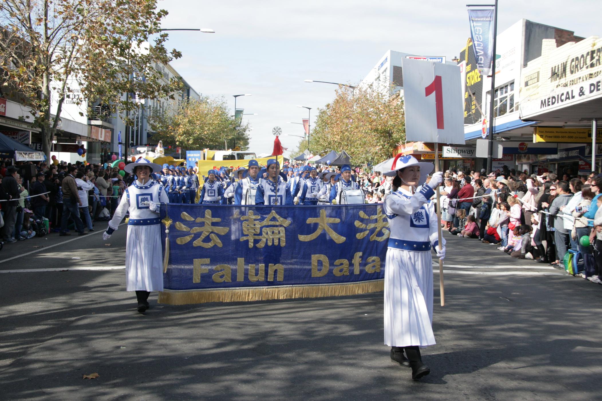 ![]() “法轮大法”横幅引领整个布莱克镇游行队伍 |