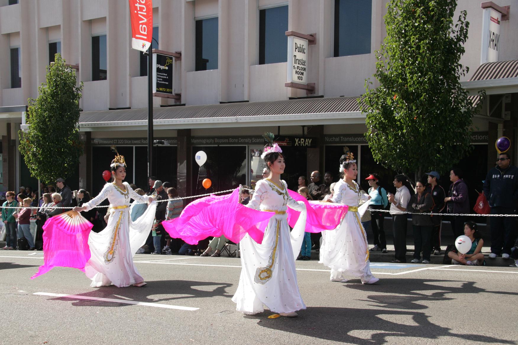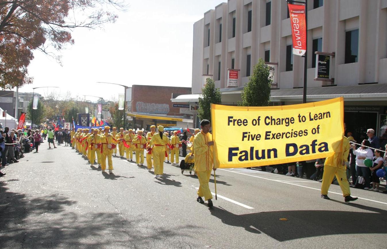 今年是法轮功团体第十次受当地市政府邀请参加这盛大的节日庆典活动。当天国乐团经过主席台时,主持人向观众介绍:“游行队伍过来了。走在最前面的是法轮大法的天国乐团。法轮大法是中国传统的修炼,包括身体和精神。他有五套功法,舒缓放松,容易学习,而且是免费教功。现在世界上一百多个国家有超过一亿人在修炼这套功法。让我们以掌声欢迎法轮功的天国乐团。”随之掌声和欢呼声伴随着天国乐团雄壮的乐曲响彻云霄。不少观众拿起相机拍下这精彩的一幕。