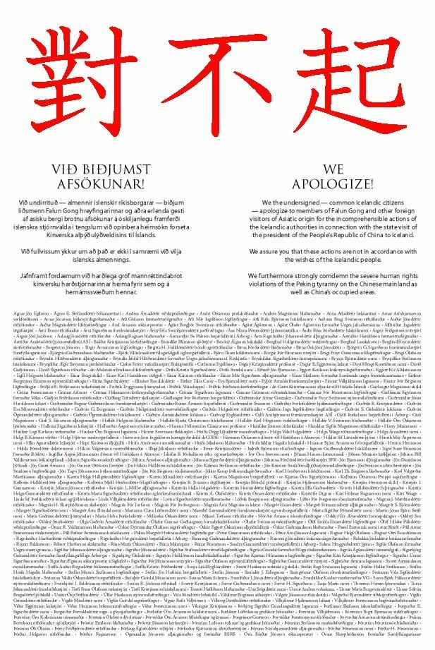 六月十三日,由冰岛国会议员、社会知名人士等四百五十人联名在首都雷克雅未克最大一家报纸——《莫干布拉迪日报》(Morgunbladid)上刊出巨幅广告,广告名称用“对不起”三个大中文字标出,英文标题的内容是“向法轮功学员道歉”。道歉启事中说:“我们这些在此签名的普通冰岛公民,就冰岛政府为了中共国家主席的到访而采取的无法理解的行动,向法轮功学员和其他外国的亚裔游客道歉。我们向你们保证,这些行动不代表冰岛人民的意愿。此外,我们强烈谴责北京独裁者在中国大陆严重践踏人权的行径。”