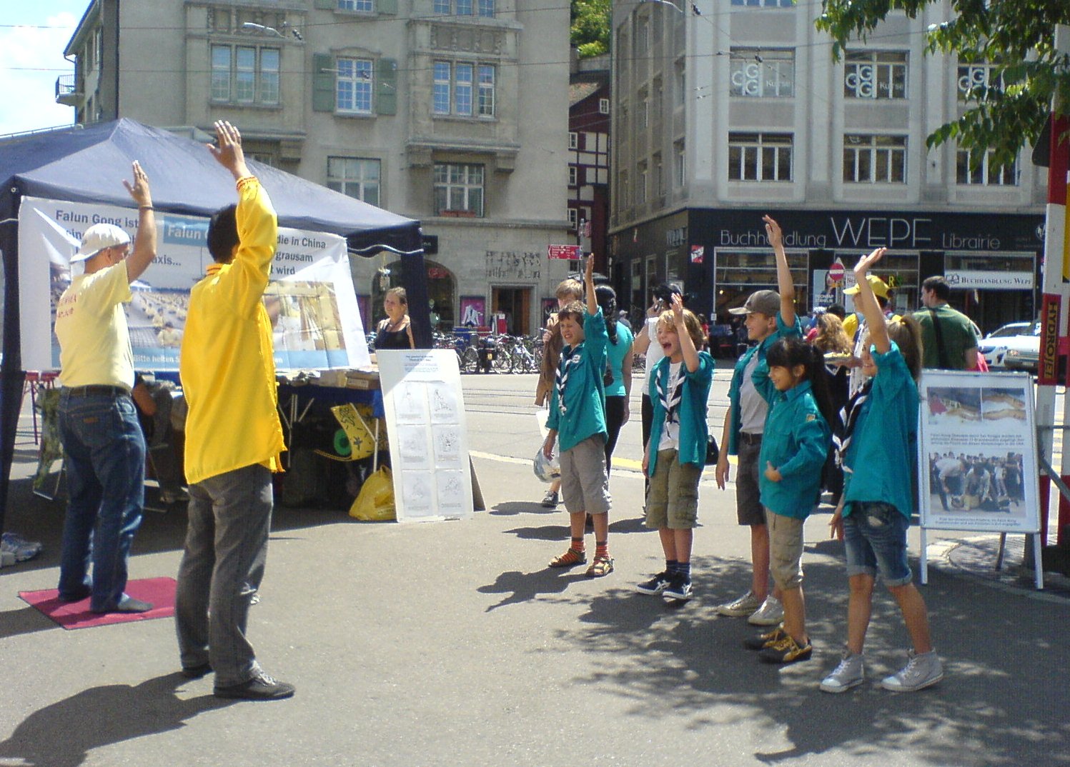 在法轮功学员做功法演示时,来了一帮可爱的孩子,他们被这舒缓、平和的功法吸引了,饶有兴致地跟着学了起来。