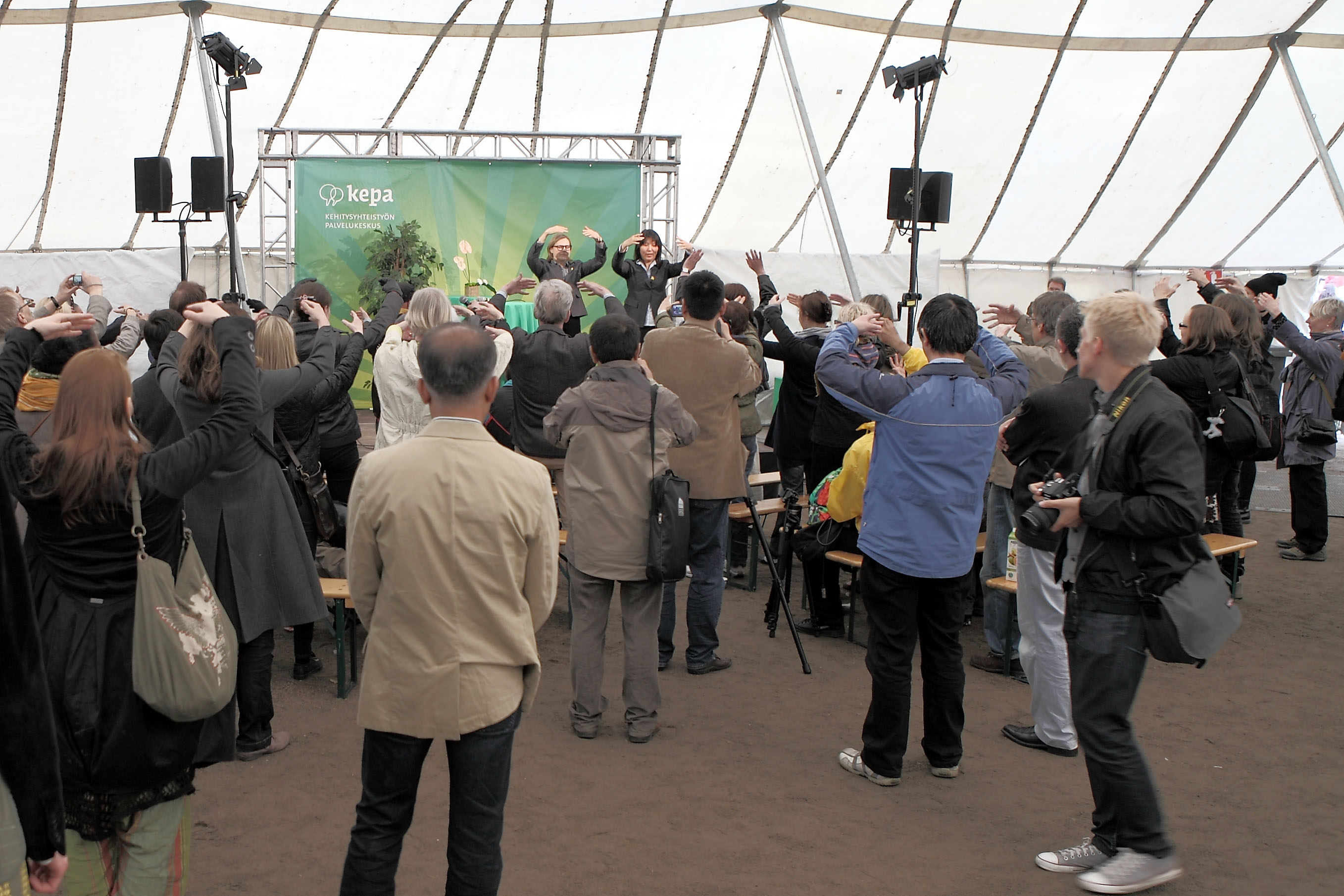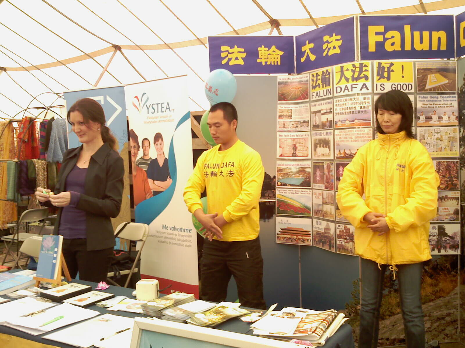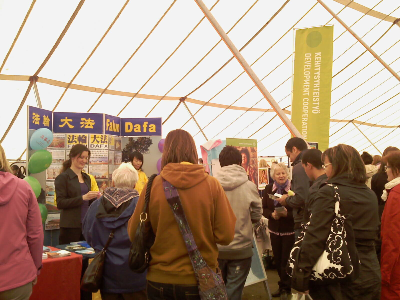 “世界村”是展现多元文化的庆典,每年都吸引着几万人参加,是芬兰最热闹的活动之一。法轮功学员演示功法时祥和的神态、舒缓的动作、优美的音乐,吸引了很多人来观看和了解。也有人询问学功的地点和时间。