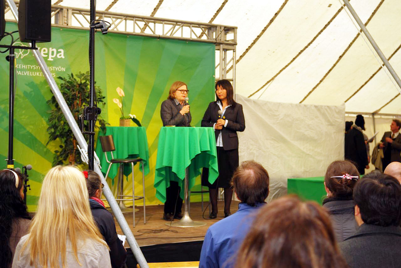 应主办方邀请出席本次活动的欧洲议会议员、人权委员会主席海蒂•浩塔拉(Heidi Hautala)女士在舞台上对法轮功学员吕适平进行了专访。