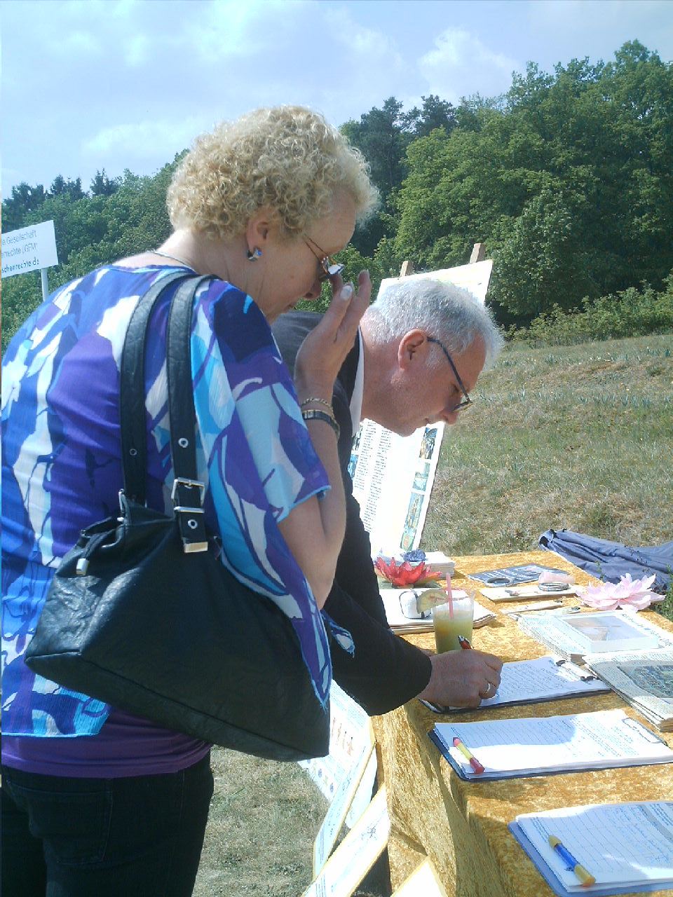 ![]() 普法尔茨州议会议员托马斯•万施在法轮功的展位上签名谴责迫害 |