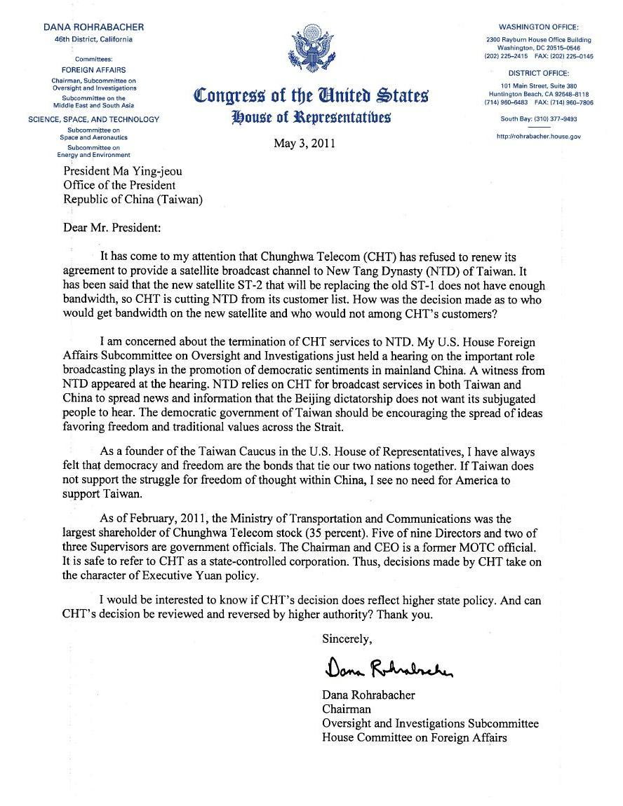 美国国会民主党资深众议员、国际关系委员会分管美国外交政策监督和调查工作主席戴纳•罗拉巴克(Dana Rohrabacher)在五月三日“世界媒体自由日”当天发出一封给中华民国总统马英九的信函,主要针对台湾的电信龙头,中华电信旗下的国际电信分公司在四月中对新!唐!人:亚太电视台表示今年八月卫星服务合约到期后不再续约,不提供新!唐!人:亚太台“中新二号”卫星频道服务。罗拉巴克强烈质疑这个决定的背后动机。