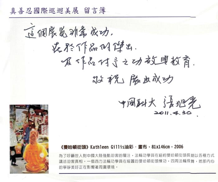 '张旭光教授在留言本上赞许真善忍美展的作品具有净化人心和社教功能的价值'高精度图片
