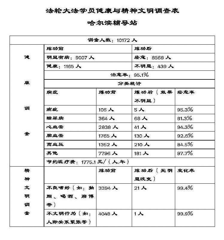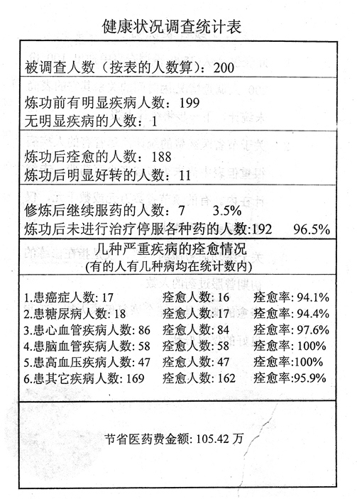 此次调查分析结果:被调查总人数是一万零一百七十二人。其中,炼功前:身体健康无病者一千一百六十五人,有病者九千零七人(均有市级医院诊断的病历);炼功后:痊愈者八千五百六十八人,身体有好转但不明显者四百三十九人;治愈率达95.1%。