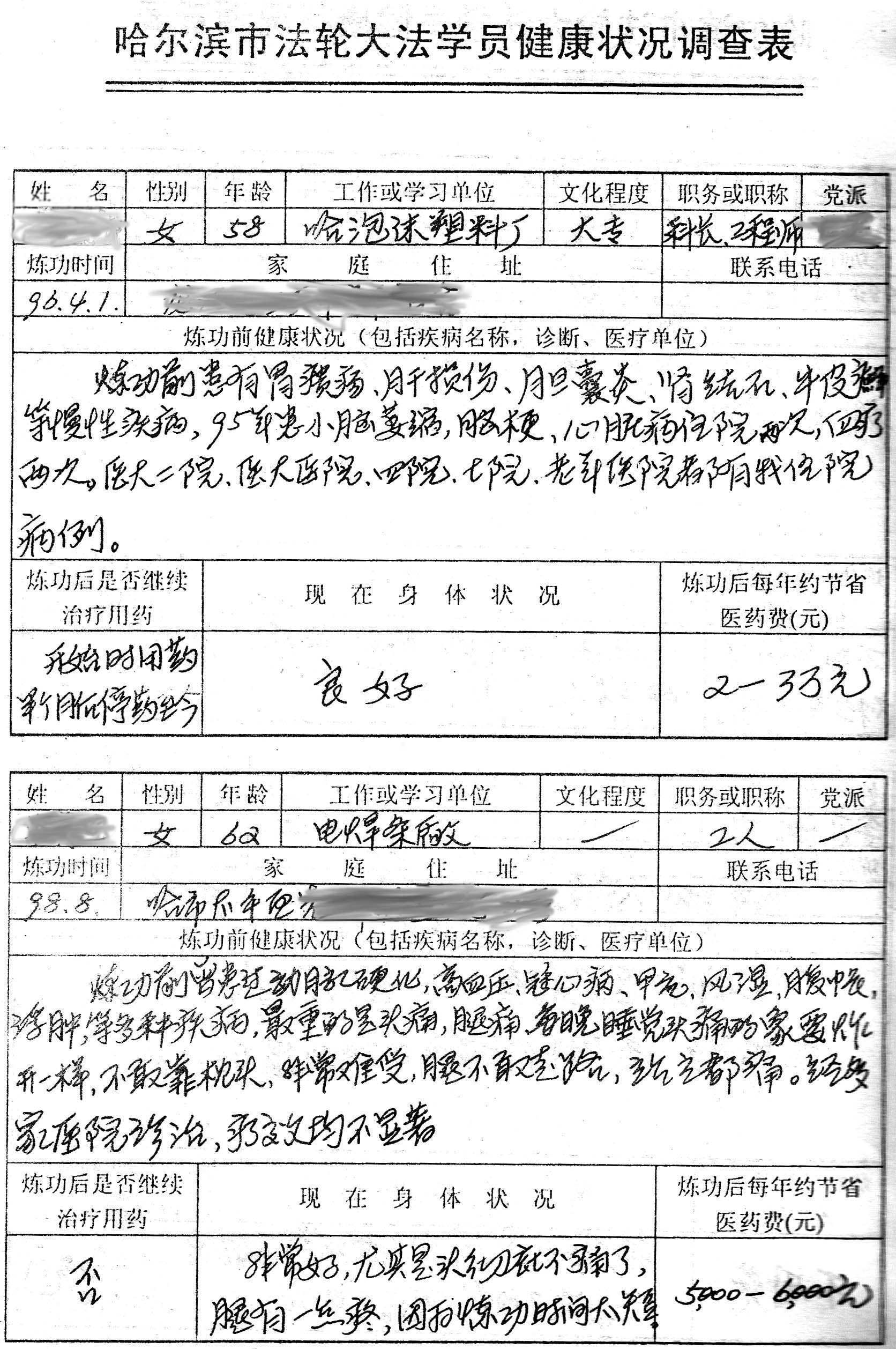当时的调查仅限于哈尔滨市当时的道里、道外、南岗、太平、香坊、动力等几个区,不包括其它所辖区市。接受调查填表的人都是当时每天坚持在炼功点上炼功的法轮功学员,填报的姓名、家庭住址、工作单位和电话都是真实的。据有关的老学员回忆,调查前后大约用了一个月的时间。