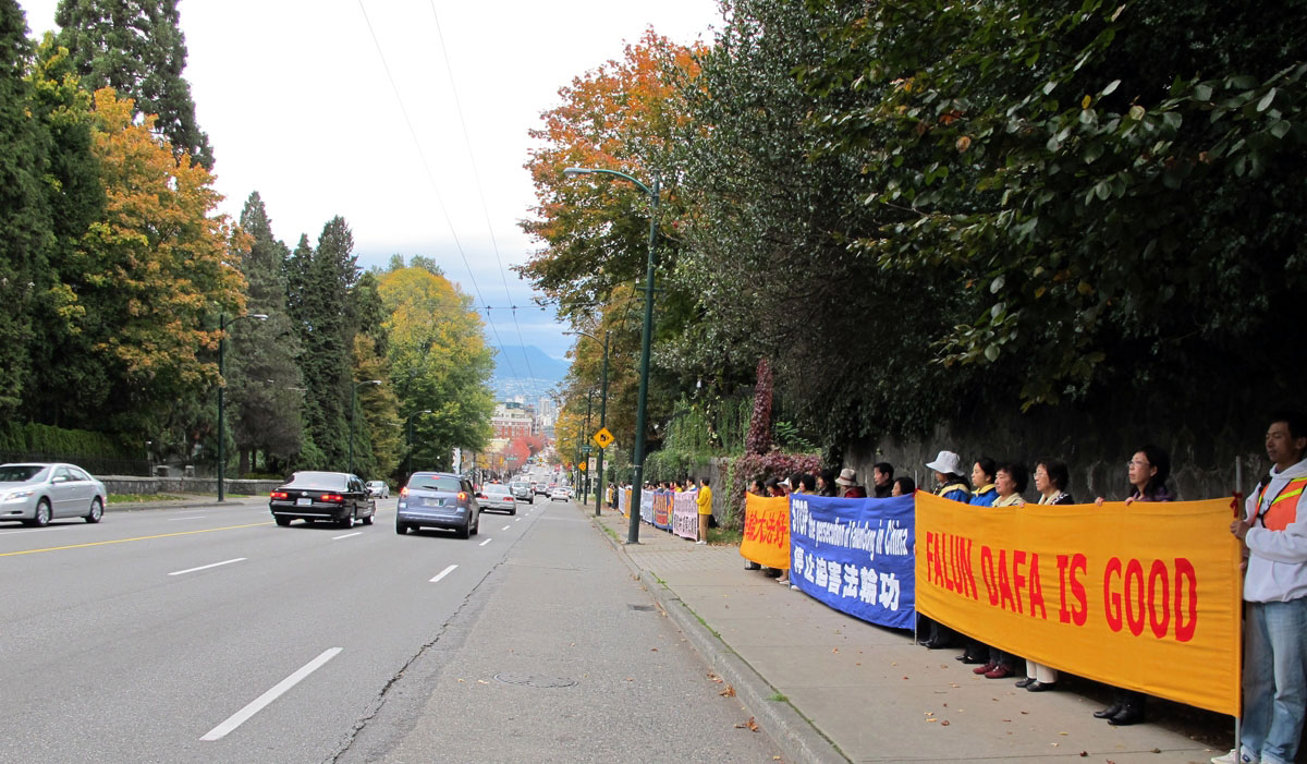 ![]() 温哥华法轮功学员在中领馆前打横幅 |