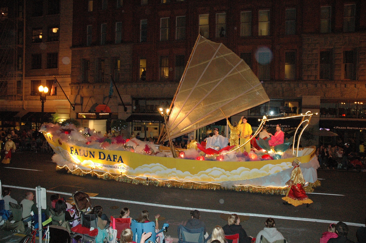 法轮大法的“法船”还没启航,就有很多人被“法船”所吸引,走过来询问和摄影留念。有几个中国学生迎面走来,有的摄像,有的刚开始时看到法轮大法的横幅,有点疑惑,但一看到大“法船”,马上脱口而出:“太好了!”再看到“法船”上的仙女们在演示优美柔和的功法,他们都静静的观看。