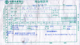 ![]() 这张图片是国保不法人员敲诈张英仙家人一千元钱的收据。从收据上,只能勉强辨别1000的数字。至于“项目名称”栏,根本看不清楚。收款人是谁,也没标注。 |