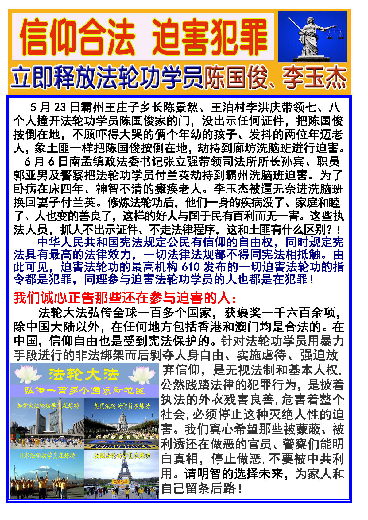 不干胶:立即释放法轮功学员陈国俊李玉杰(霸州)