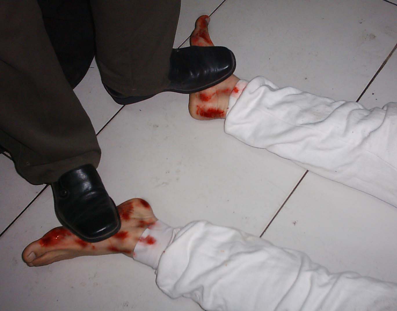 ![]() 酷刑演示:长时间坐小板凳,不许睡觉,旁边有犹大监视,大声地念污蔑、诽谤大法的书,长时间受此刑者臀部肌肉坏死,呈黑紫色。 |