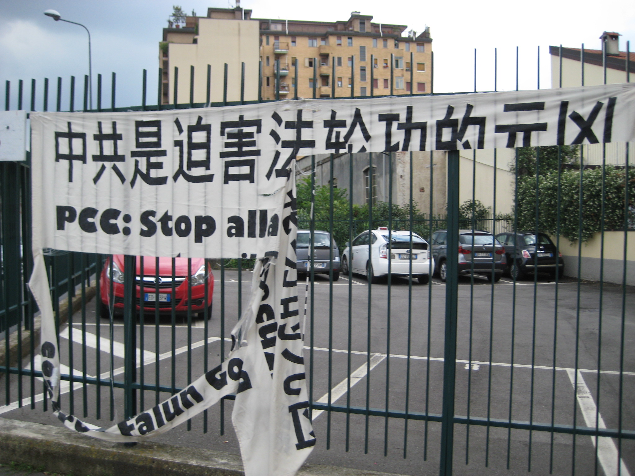 “中共是迫害法轮功的元凶”这条横幅就是法轮功学员在六月四日中共副主席习*近*平访问米兰时,在习入住的旅馆前抗议时打出的三条横幅之一,曾令中共官员和特务感到胆寒。