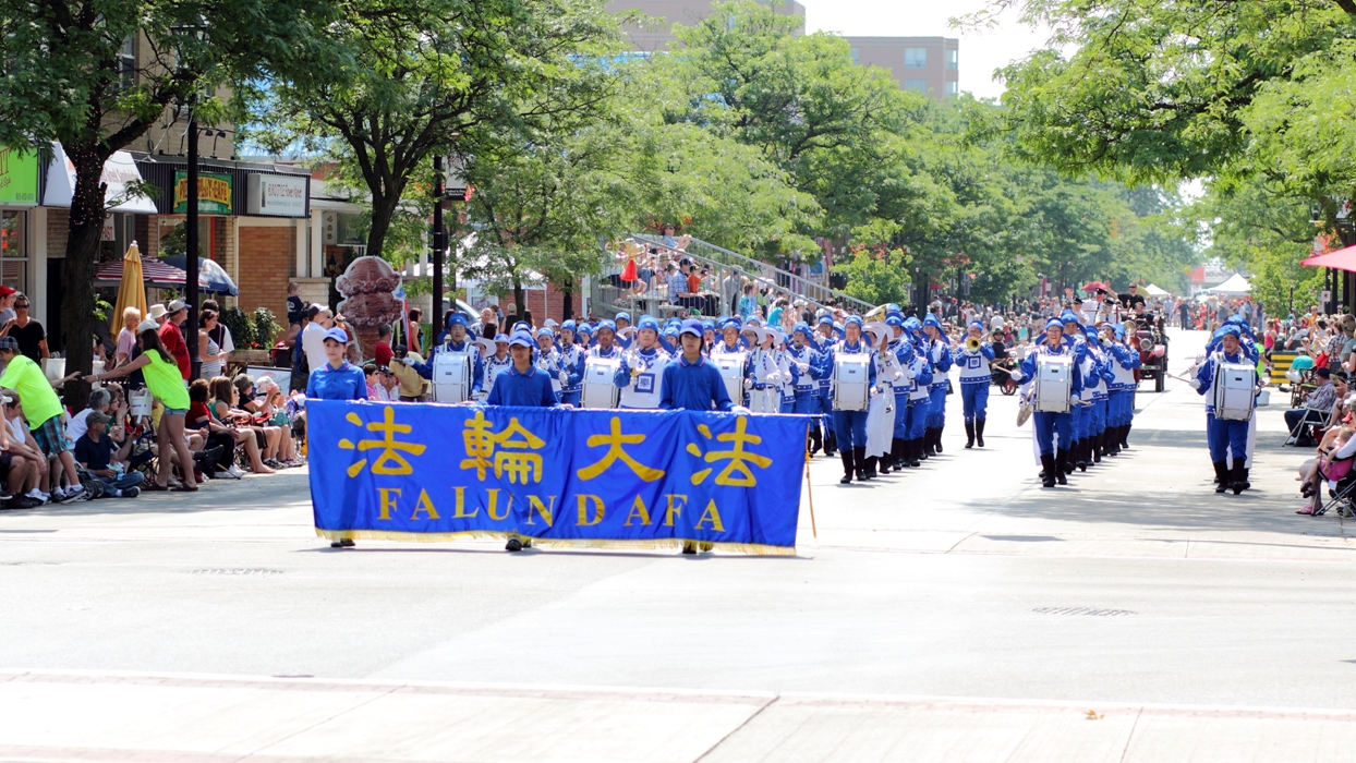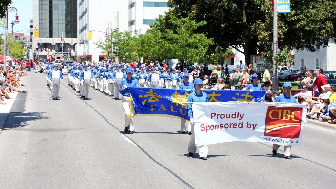 当队伍经过观众台时,主持者介绍说:“天国乐团成员来自多伦多,来自不同的族裔及文化,大部份团员是华人,年龄从十几岁至七十多岁。所有团员都修炼法轮大法,包括打坐及动功,以及遵从宇宙的原理‘真、善、忍’。演奏的曲目包括《法鼓法号震十方》、《送宝》、《法轮大法好》、《法轮圣王》以及《永远的枫叶》。团员来自社会不同阶层及文化背景,天国乐团真正代表着加拿大人引以为豪的多元文化。”