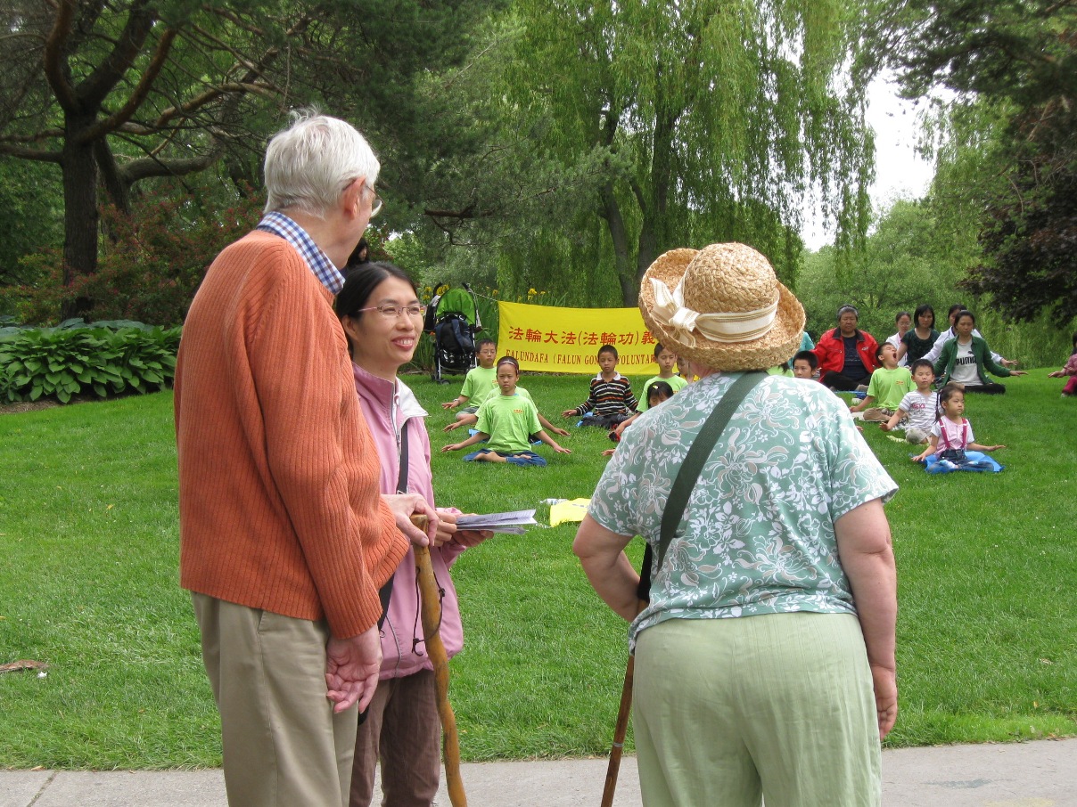 在等渡船到中央岛的过程中,很多人都被祥和的炼功场面吸引过来照相,也有不少人想知道桌上摆着的中文光盘和各种各样的中文资料是什么,有不少西人询问有没有英文的资料。一位专门处理难民案件的官员和他太太逗留了很长时间,他太太听学员介绍中共活体摘取法轮功学员器官事件时表情非常严肃。最后那位官员把桌上的《法轮功被迫害专刊》要走了。