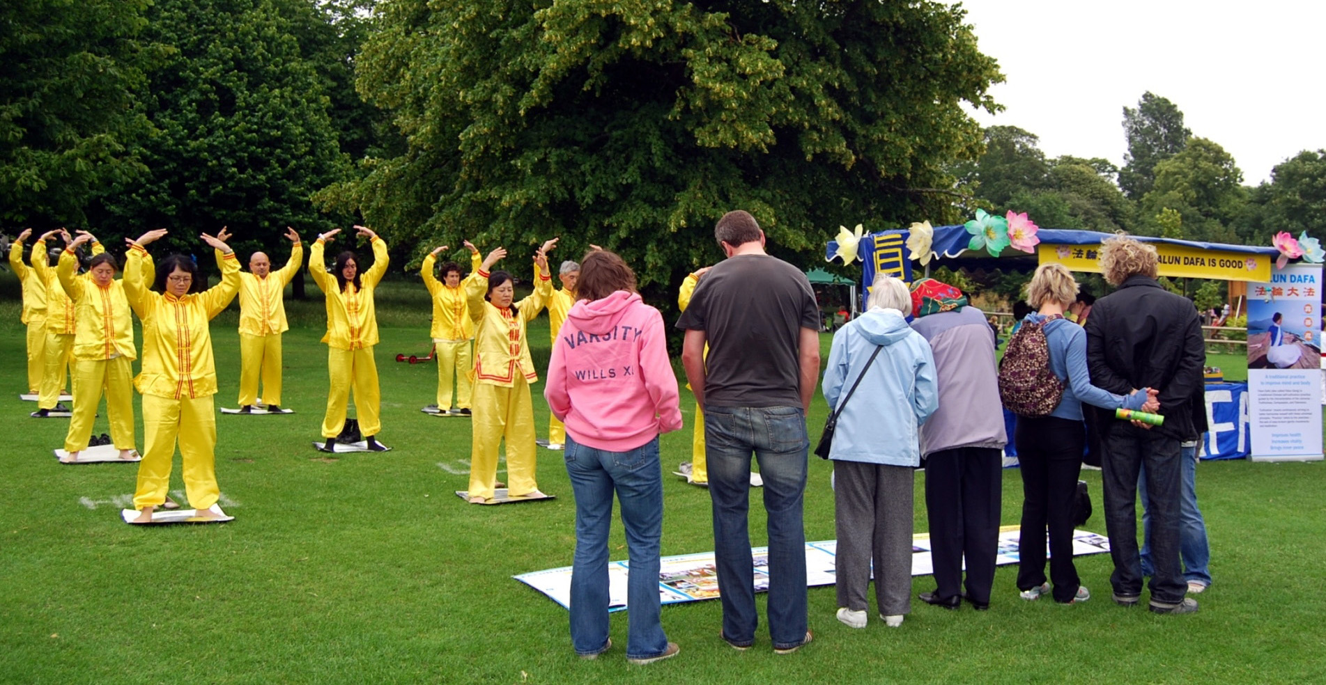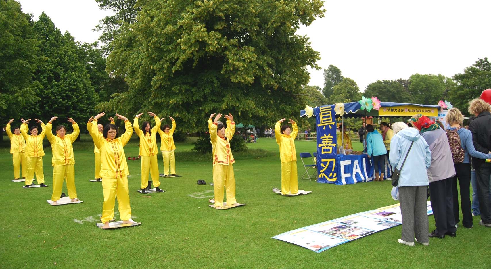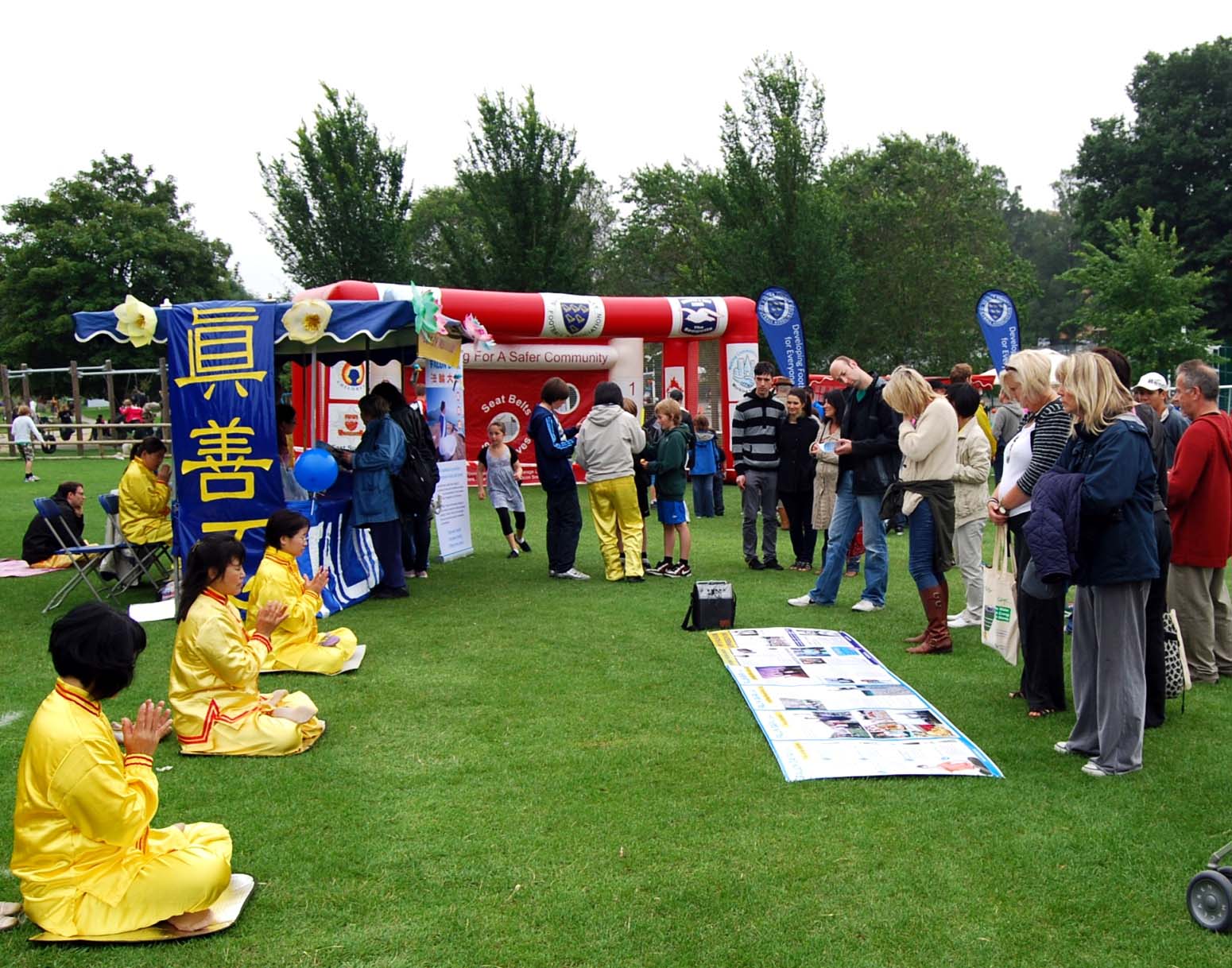![]() 英国法轮功学员在布莱顿及赫维国际体育节上展示法轮功五套功法,民众认真阅读展板。 |