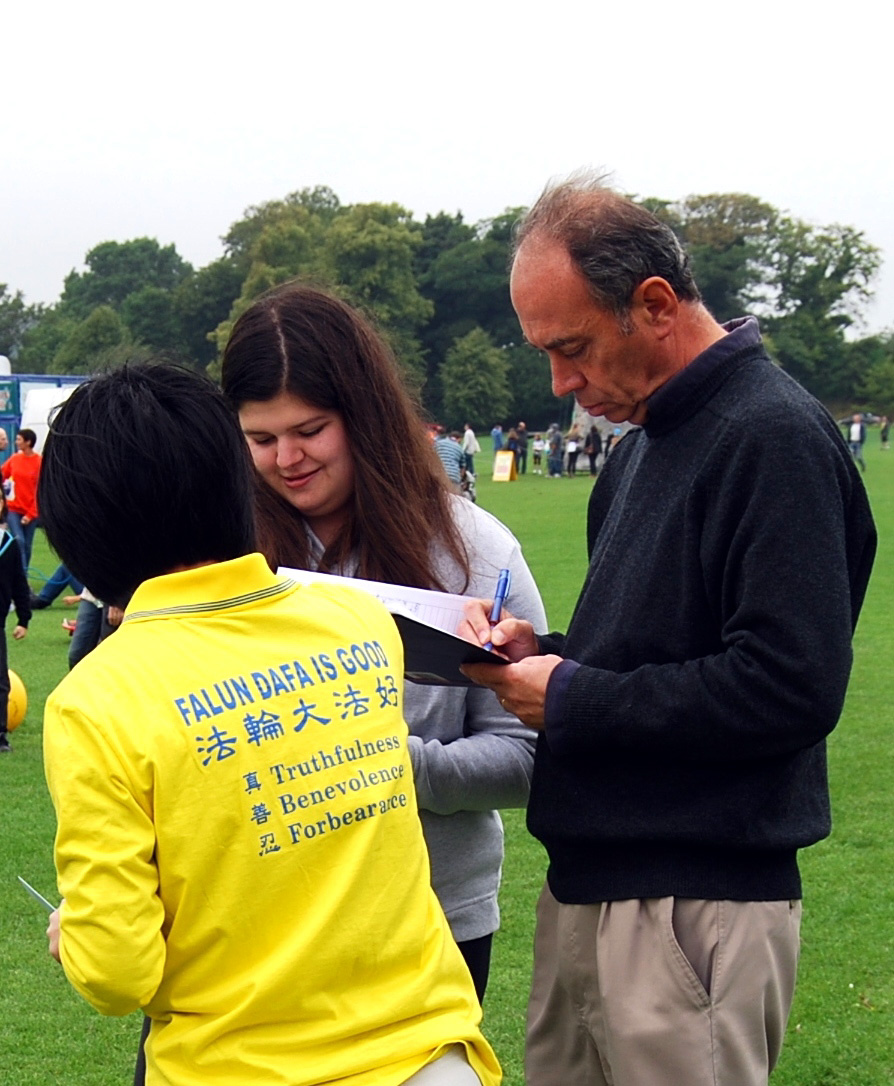 和女儿一起来参加体育节的中年男士弗莱利(Firle)对记者说,法轮功功法给他平静、放松的感觉。他和女儿都在征签表上签了名,谴责中共对法轮功的迫害。弗莱利认为中共迫害、禁止象法轮功这样和平的团体毫无道理。当得知中共活摘法轮功学员人体器官贩卖时,他非常震惊。在和学员交谈之后,他拿了揭露中共活摘器官罪恶的传单,以做进一步了解,并表示将告诉朋友们这一消息。