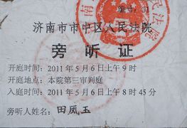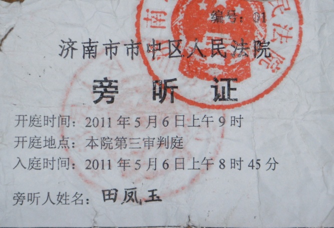 二零一一年五月六日我母亲刘玉晶的案件开庭当日,我和父亲来到济南市市中区法院门口要求旁听庭审,法院门口的人拒绝了我们的旁听。我和父亲都带了身份证,并且我父亲还持有于前一日在市中区法院领取的“旁听证”。
