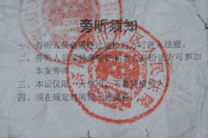 我于五月六日开庭当日持身份证要求旁听,法院工作人员说不出任何理由,但就是不让我旁听。当我进一步责问其有什么根据不让我旁听时,法院的人说什么:“新的内部规定”。我不知道这个“内部规定”是什么,这个“内部规定”是不是合法的,但我无理被拒绝旁听是事实。我作为一个中华人民共和国的公民,又是当事人的亲生女儿,持有合法的身份证明却被市中区法院以“内部规定”拒绝旁听,这明显违反了刑事案件“公开审判”的原则,属玩忽职守行为。